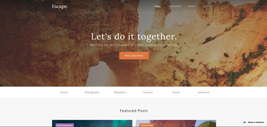 Escape is a simple, versatile free blog template created by Webflow. It's built for photographers, bloggers, and content creators who want a clean reading experience.